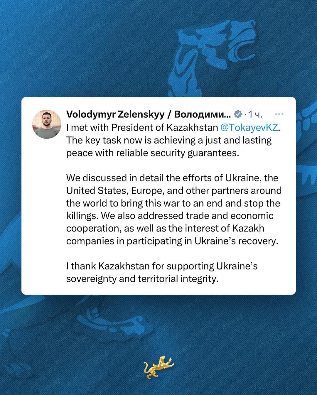 Володимир Зеленський: "Зустрівся з Президентом Казахстану Касимом-Жомартом Токаєвим. Зараз ключове завдання – досягнення справедливого й тривалого миру, із надійними гарантіями безпеки.